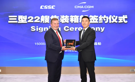 4月30日,中國船舶集團旗下中船貿易攜手江南造船、滬東中華、北船重工聯合承接法國達飛海運集團3型22艘集裝箱船訂單,中國船舶集團黨組成員、副總經理孫偉,達飛集團執行副總裁澤維爾出席簽約儀式。