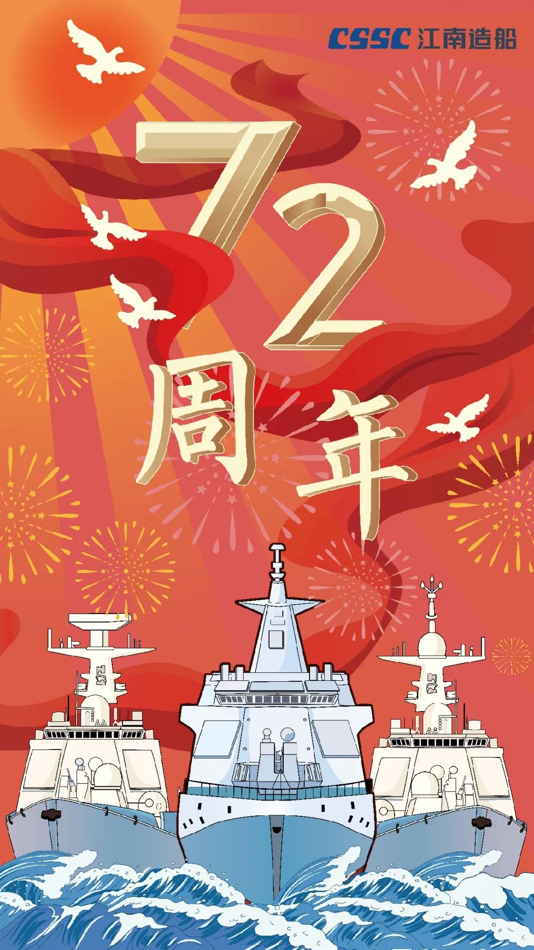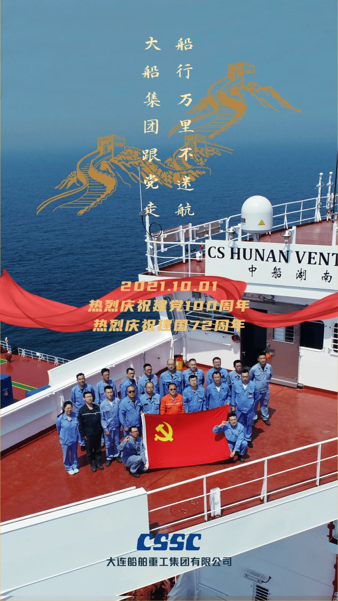 今天,我們迎來新中國72周年華誕。作為我國海軍裝備建設(shè)的主力軍,中國船舶大船集團將不忘初心,牢記使命,堅定貫徹海洋強國、制造強國、科技強國國家戰(zhàn)略,聚焦主責主業(yè)、聚力興裝強軍,為實現(xiàn)中華民族偉大復(fù)興的中國夢而不懈奮斗。