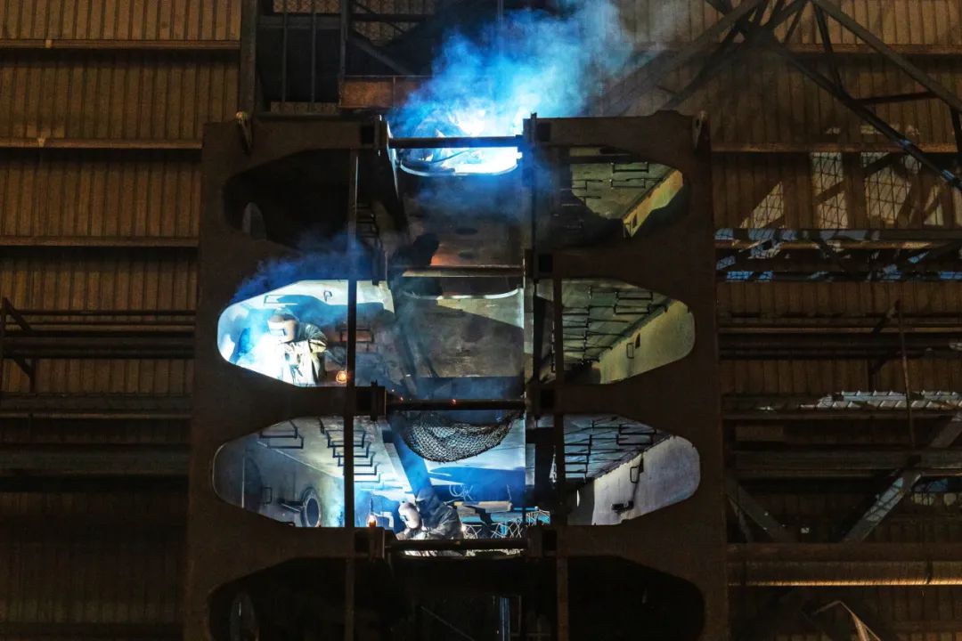 大船集團(tuán)全體干部職工統(tǒng)一思想,凝心聚力,堅(jiān)守本職擔(dān)當(dāng),積極主動(dòng)作為,爭(zhēng)分奪秒,奮力沖刺。其中FPSO-8項(xiàng)目是大船集團(tuán)建造的第七艘FPSO。今年以來,F(xiàn)PSO-8項(xiàng)目提前計(jì)劃節(jié)點(diǎn),順利實(shí)現(xiàn)鋪底,并完成了連續(xù)六個(gè)總段的塢內(nèi)合攏。