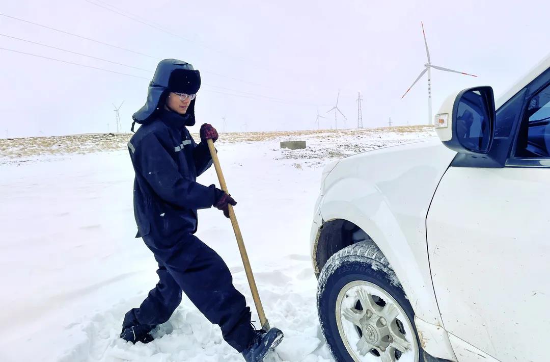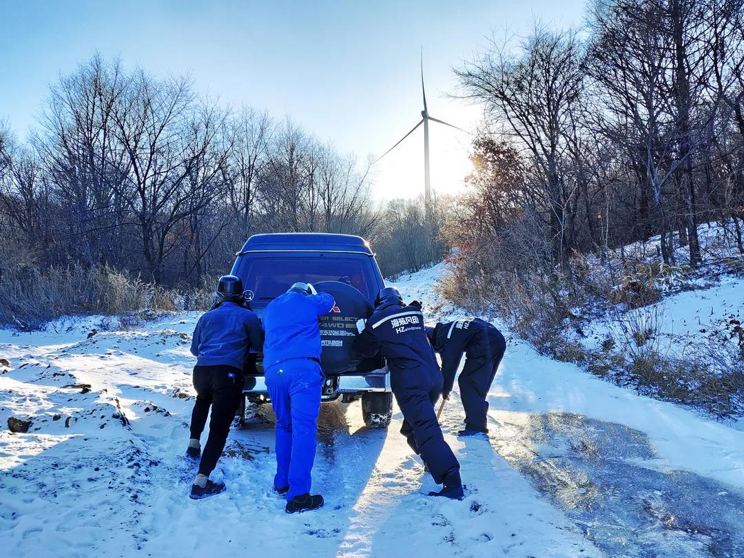進(jìn)入11月,內(nèi)蒙古自治區(qū)錫林郭勒盟地區(qū)迎來大面積的暴風(fēng)雪,烏達(dá)萊項(xiàng)目人員在趕往風(fēng)場(chǎng)的路上遭遇積雪路段,雖然氣候嚴(yán)寒,但為了及時(shí)消除機(jī)組故障,大家在積雪路段采取挖雪推車的方式齊心協(xié)力,一同開展清理路面積雪的行動(dòng)。這個(gè)冬日,冰雪阻擋不住海裝追風(fēng)者們勇往直前的步伐,他們只為恪盡職守完成一個(gè)承諾——風(fēng)機(jī)旋轉(zhuǎn)、帶來光熱。