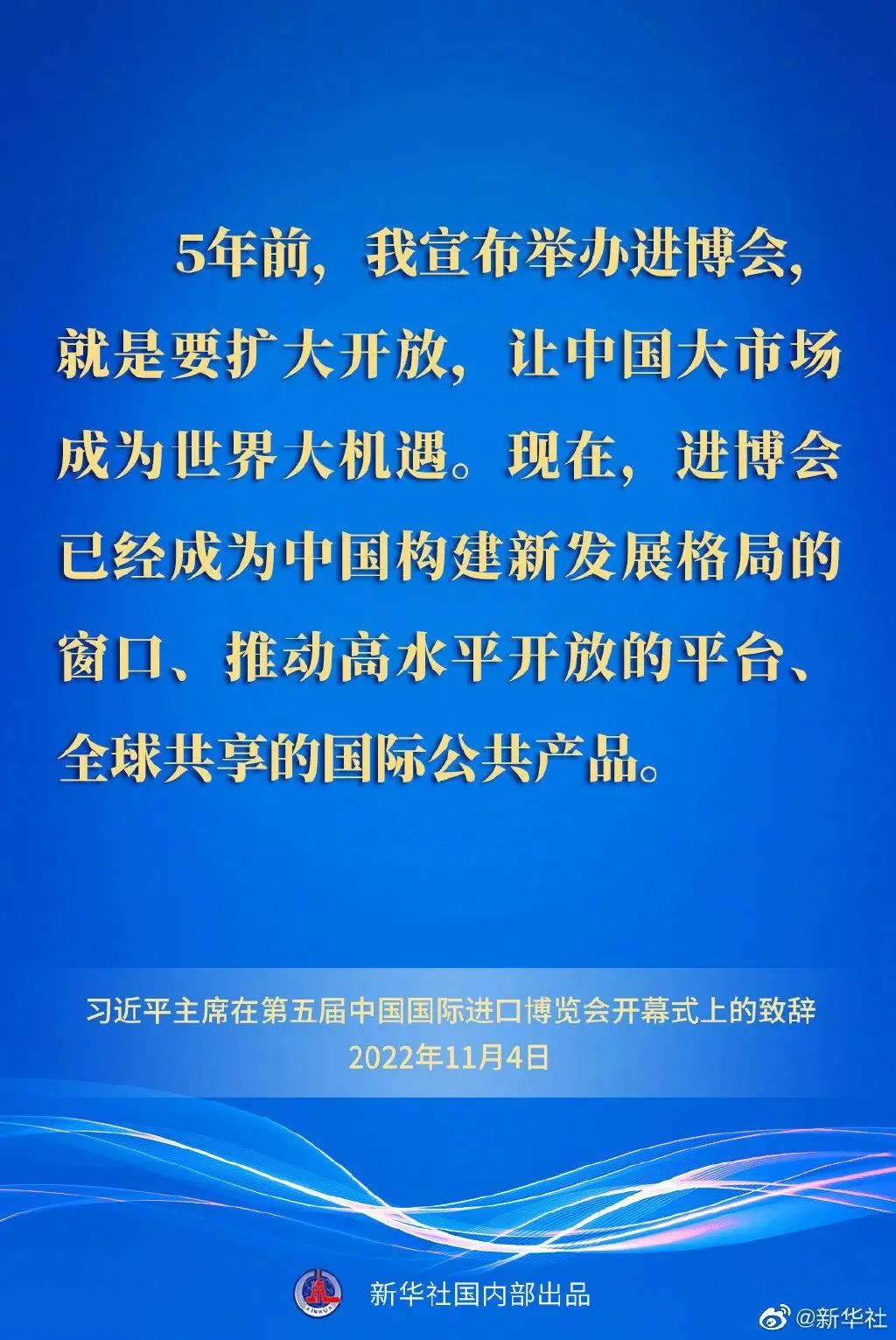 習近平指出,5年前,我宣布舉辦進博會,就是要擴大開放,讓中國大市場成為世界大機遇。現(xiàn)在,進博會已經(jīng)成為中國構建新發(fā)展格局的窗口、推動高水平開放的平臺、全球共享的國際公共產(chǎn)品。