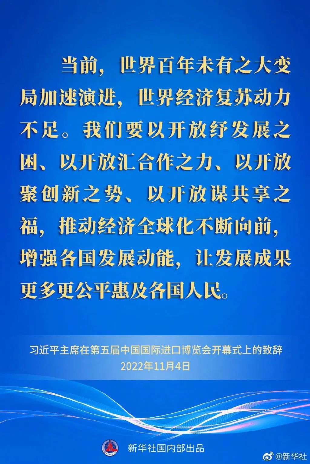 習近平強調,開放是人類文明進步的重要動力,是世界繁榮發(fā)展的必由之路。當前,世界百年未有之大變局加速演進,世界經(jīng)濟復蘇動力不足。我們要以開放紓發(fā)展之困、以開放匯合作之力、以開放聚創(chuàng)新之勢、以開放謀共享之福,推動經(jīng)濟全球化不斷向前,增強各國發(fā)展動能,讓發(fā)展成果更多更公平惠及各國人民。