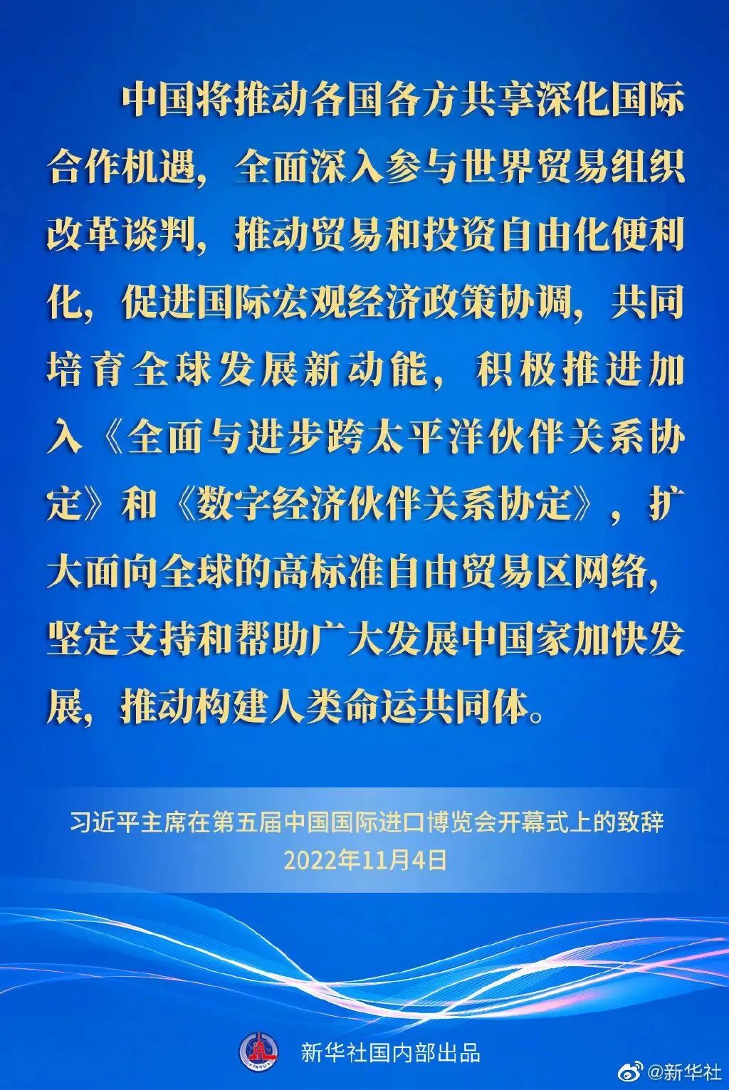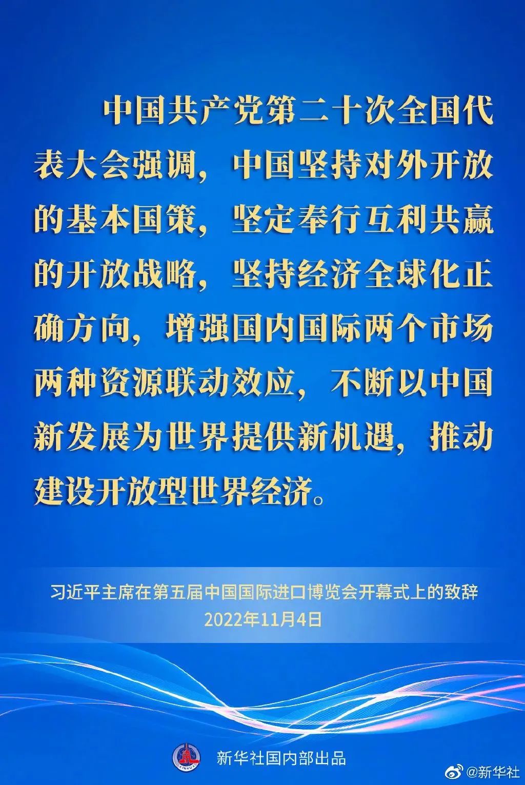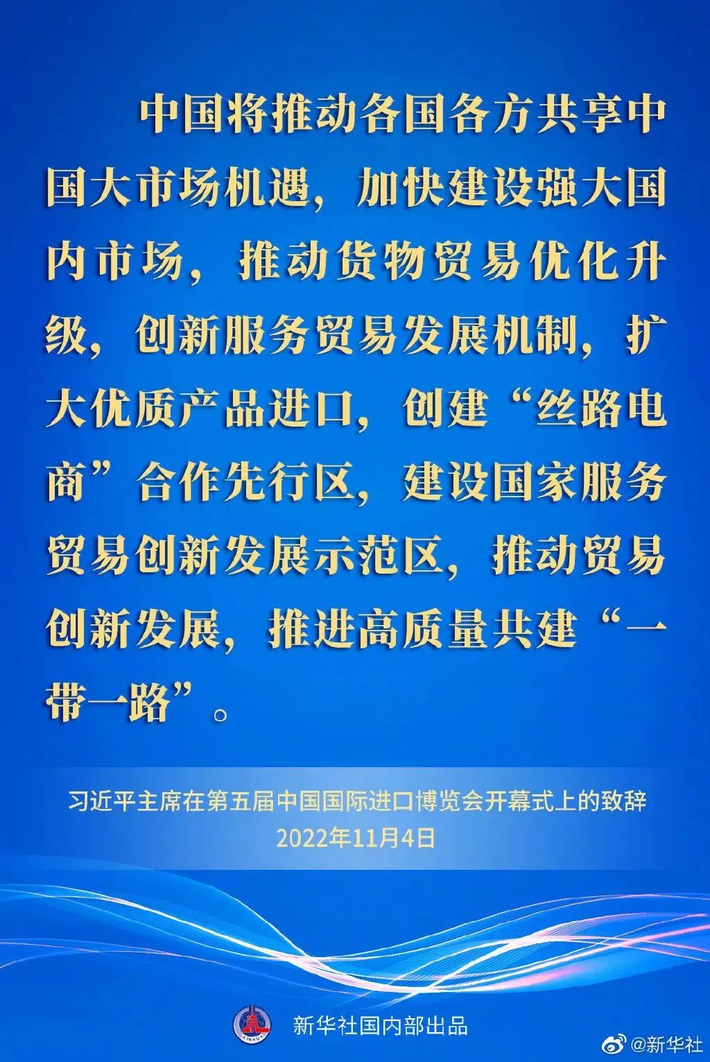 11月4日晚,國家主席習近平以視頻方式出席在上海舉行的第五屆中國國際進口博覽會開幕式并發(fā)表題為《共創(chuàng)開放繁榮的美好未來》的致辭。