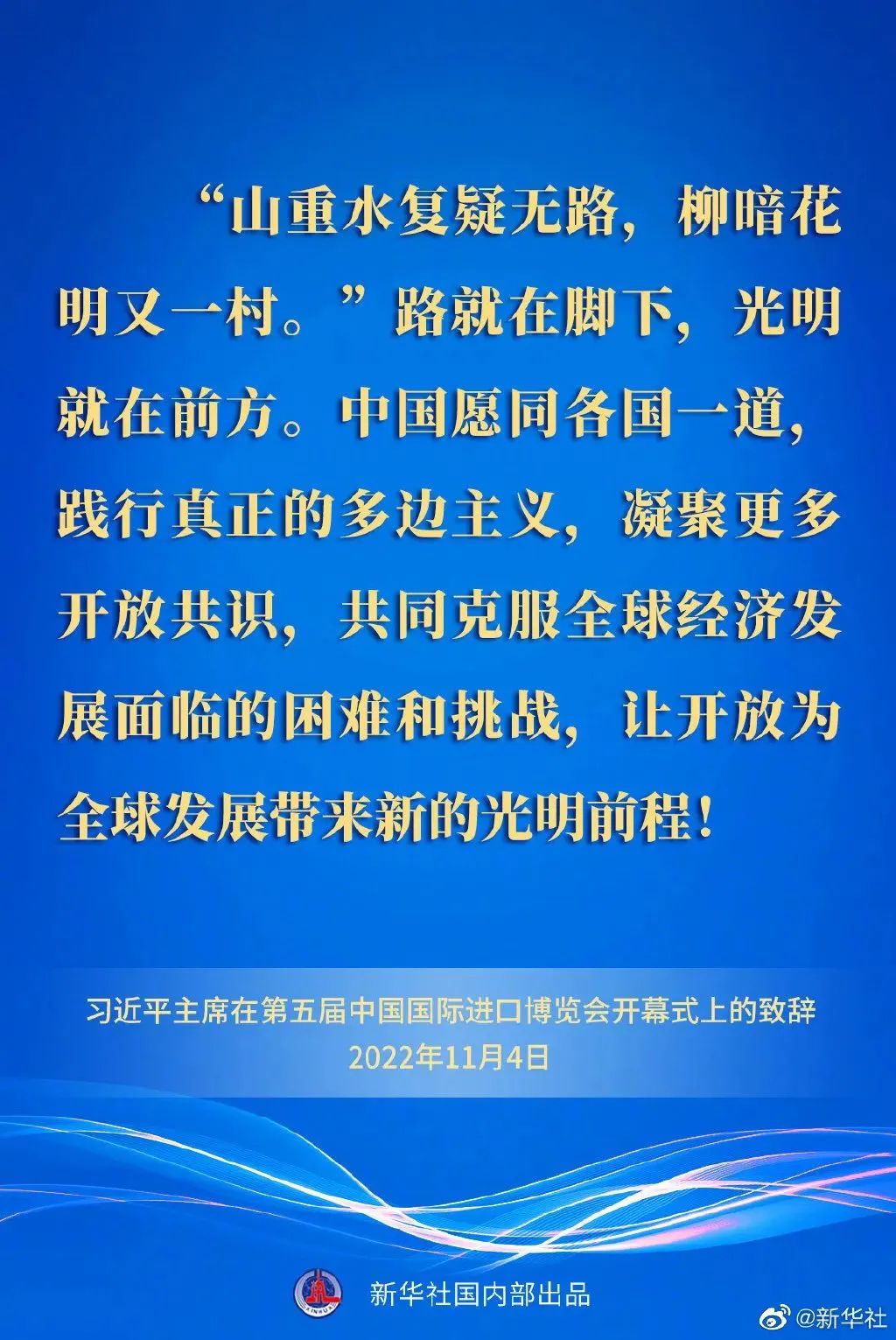 習近平最后強調,路就在腳下,光明就在前方。中國愿同各國一道,踐行真正的多邊主義,凝聚更多開放共識,共同克服全球經(jīng)濟發(fā)展面臨的困難和挑戰(zhàn),讓開放為全球發(fā)展帶來新的光明前程!