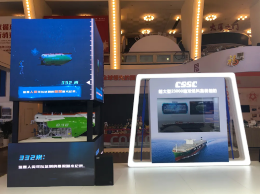 進(jìn)入中國船舶展廳,觀眾不僅能夠看到“奮斗者”號(hào)全海深載人潛水器、“雪龍2”號(hào)極地科考船等多個(gè)高科技品牌產(chǎn)品,還可以通過航空母艦、常規(guī)動(dòng)力潛艇、驅(qū)逐艦、護(hù)衛(wèi)艦?zāi)P土私馕覈鴩姥b備實(shí)力。
