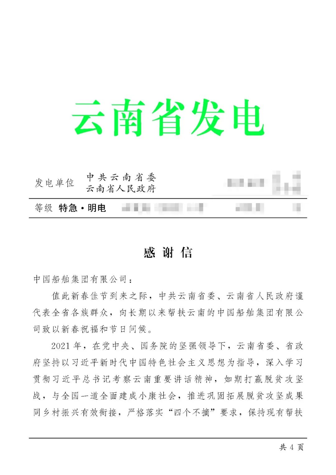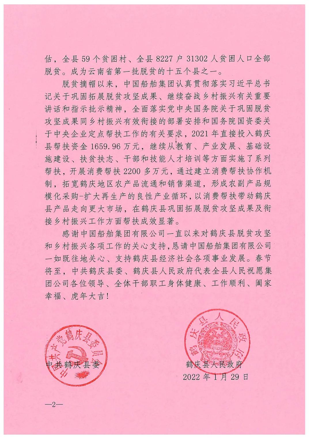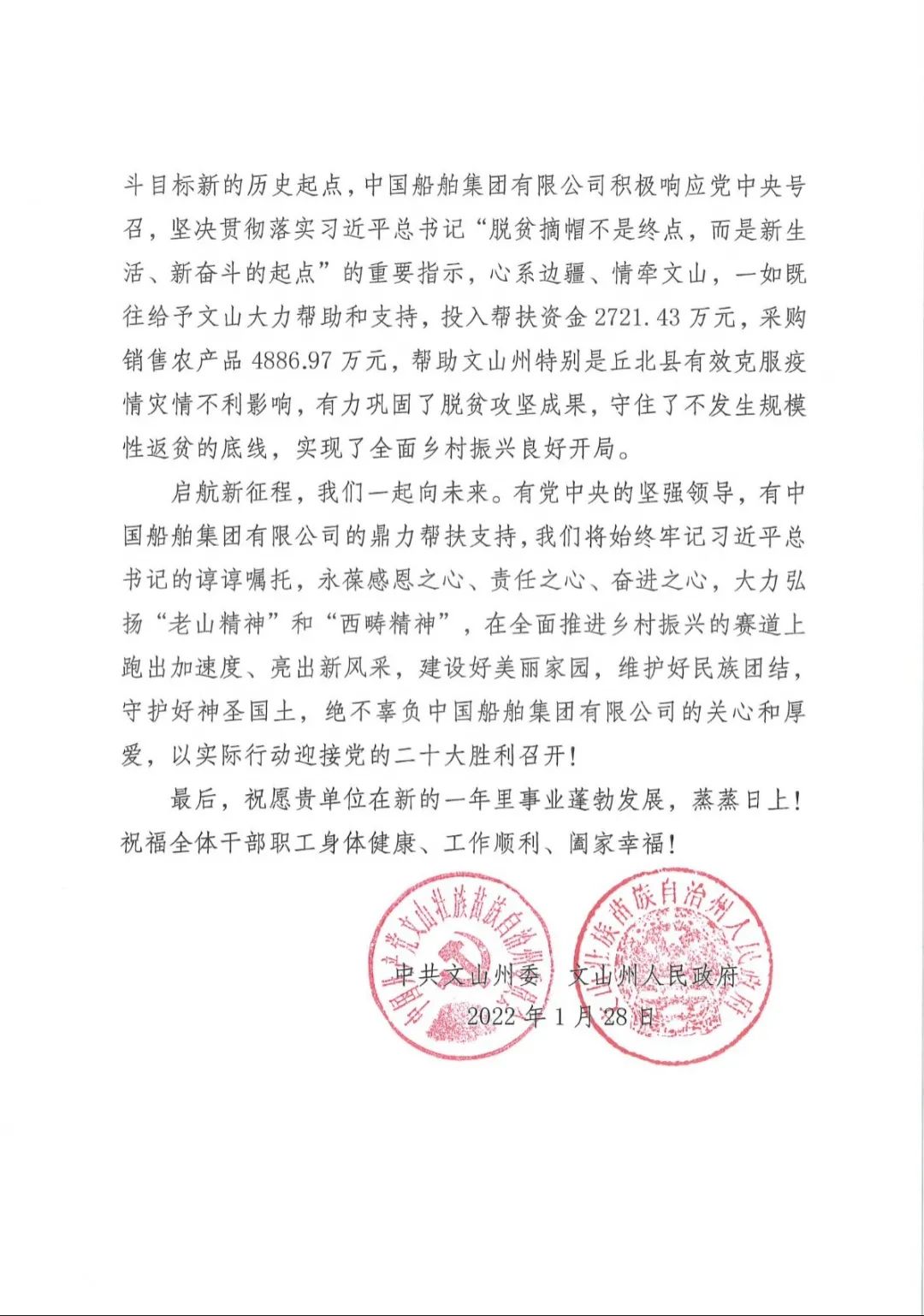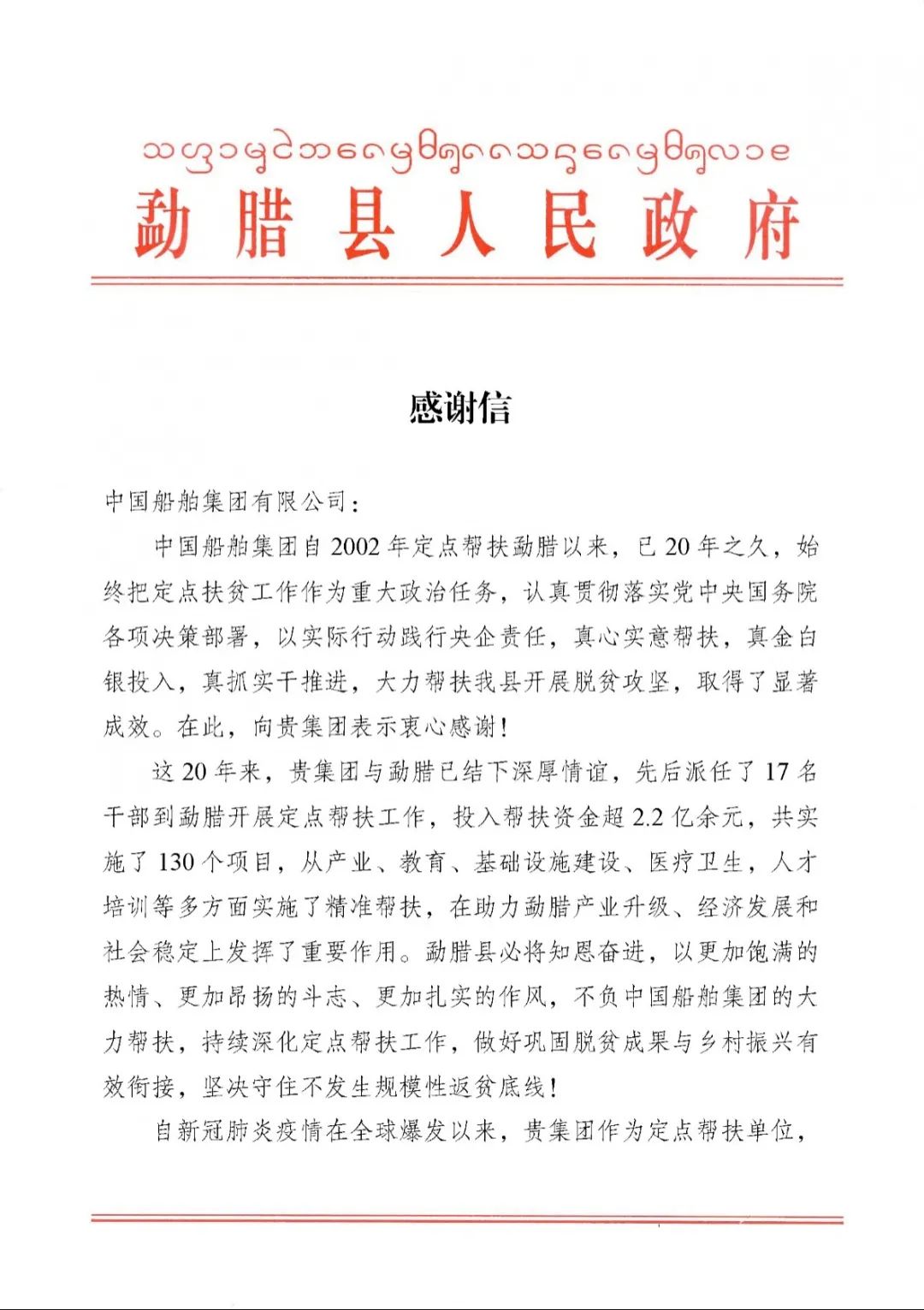 中國(guó)船舶集團(tuán)收到定點(diǎn)幫扶地區(qū)感謝信