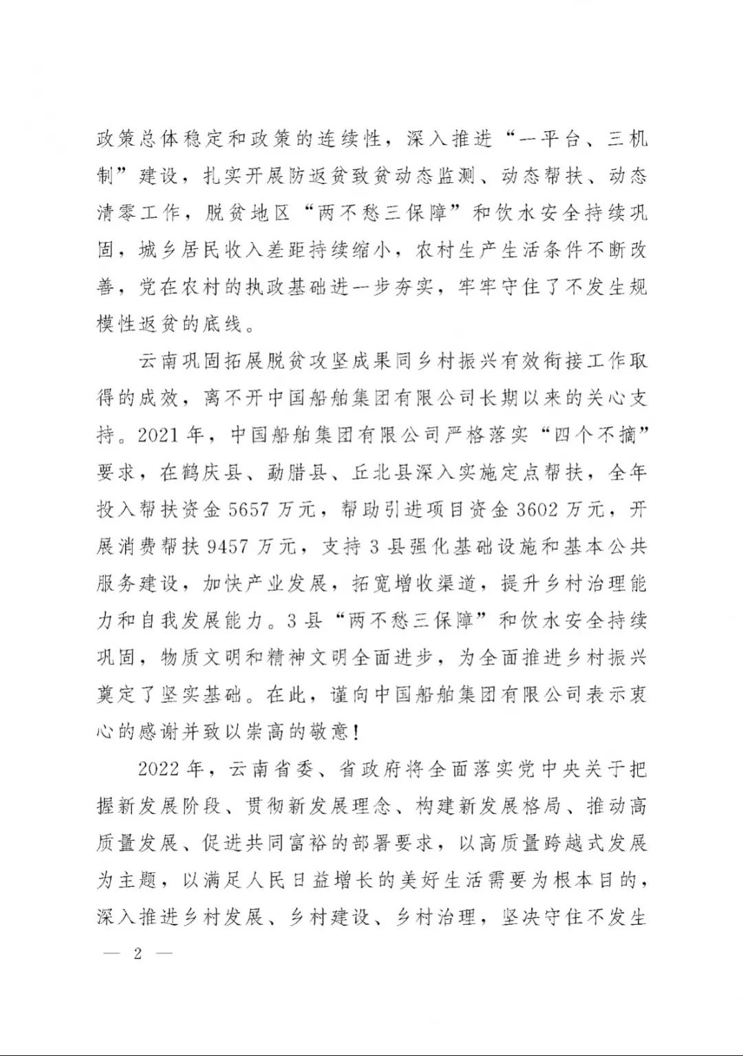 春節(jié)前夕,中國(guó)船舶集團(tuán)陸續(xù)收到云南省委省政府、文山州委州政府、鶴慶縣委縣政府、勐臘縣政府發(fā)來(lái)的感謝信,對(duì)集團(tuán)公司長(zhǎng)期以來(lái)給予鶴慶縣、勐臘縣、丘北縣的傾力幫扶表示衷心感謝和崇高敬意。
