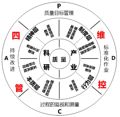 七二五所結(jié)合自身軍工科研和科技產(chǎn)業(yè)“一所兩制”的特點(diǎn),凝練形成了一套目標(biāo)明確(P)、標(biāo)準(zhǔn)作業(yè)(D)、監(jiān)管有效(C)、螺旋上升持續(xù)改進(jìn)(A)的“四維”質(zhì)量管理模式。該模式沿著精神層、制度層、行為層和本質(zhì)層四個維度實施質(zhì)量建設(shè)和管控。精神層是“核心”層,體現(xiàn)了七二五所人對質(zhì)量價值的精神追求,通過質(zhì)量文化創(chuàng)建、內(nèi)外部宣傳教育來牢固樹立四維質(zhì)量管理的理念。制度層是“法制”層,以制度形式規(guī)范質(zhì)量行為、工藝標(biāo)準(zhǔn)。建立覆蓋四大板塊的多行業(yè)立體式管理體系,形成47個特色制度,保障四維質(zhì)量管理模式的有效實施。行為層是“實施”層,通過質(zhì)量提升模型和雙零班組建設(shè)開展實施,反映了七二五所人對質(zhì)量文化精神維度的理解和對制度維度的遵守。本質(zhì)層是“目的”層,是四維質(zhì)量管理輸出的目標(biāo)產(chǎn)物,反映了產(chǎn)品、服務(wù)的本質(zhì)質(zhì)量。