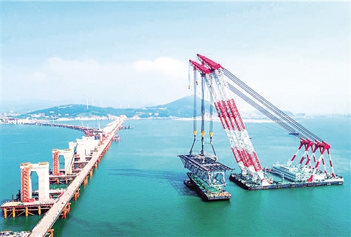 8月22日,由中鐵大橋局打造的“大橋海鷗號”起重船正在吊裝平潭海峽公鐵兩用大橋首孔簡支鋼桁梁。張 靜攝