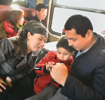 11月25日,在新疆塔克拉瑪干沙漠西南緣的喀什-和田對開火車“和田玉龍號”上,旅客們正在休息。(趙 戈 攝)