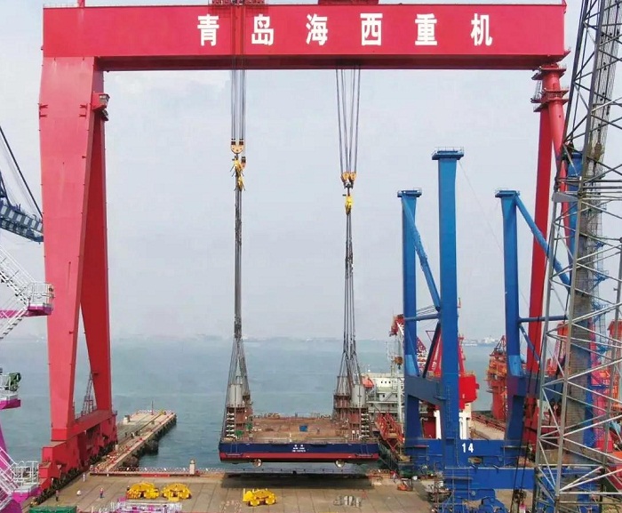 ????在該項(xiàng)目的前期建造策劃階段,海西重機(jī)沒(méi)有采用常規(guī)船塢下水或滑移下水方式,而是大膽提出利用1600噸龍門(mén)吊整體吊裝下水的設(shè)想。經(jīng)過(guò)一系列重量預(yù)估及方案論證,最終核定吊裝下水重量接近1440噸。