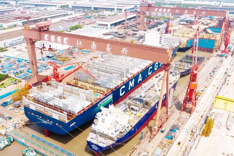 ????眾所周知,船塢是船舶總組搭載的場所,是造船生產的核心資源。江南造船3號船塢長580米、寬120米,是目前國內在用的最大船塢。為提升船塢利用效率,江南造船采取“雙線并造”模式,即一批次液化氣船和一批次超大型集裝箱船同時建造。此次雙船出塢是江南造船“雙線并造”模式的第五個批次,也是今年3號塢出塢的第二個批次。