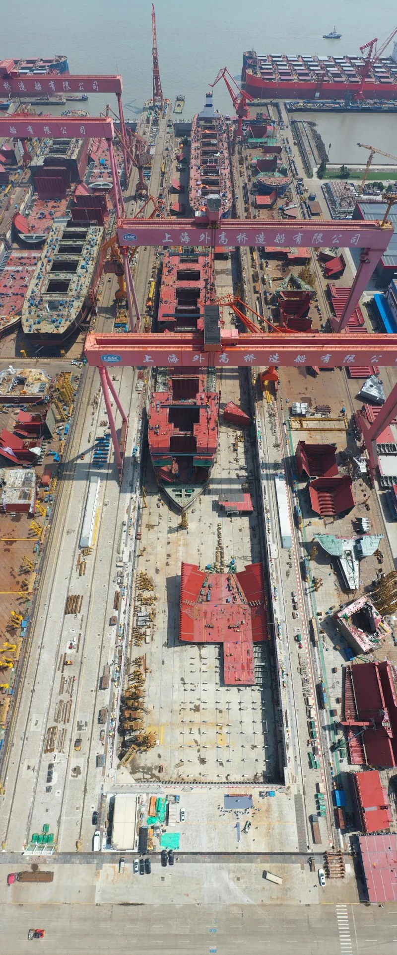 該項(xiàng)改造工程是將現(xiàn)有船塢從540米向陸側(cè)延伸200米,形成長(zhǎng)740米、寬76米的“巨無(wú)霸”船塢,其周長(zhǎng)達(dá)到1.632千米,面積相當(dāng)于7個(gè)標(biāo)準(zhǔn)足球場(chǎng),能同時(shí)滿足1艘大型郵輪總組、1艘大型郵輪舾裝的需求,達(dá)到年產(chǎn)1艘半大型郵輪的建造要求。