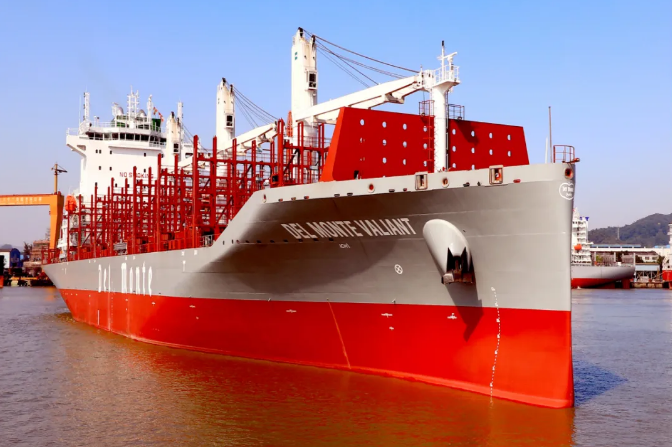 當(dāng)日下午交付的“DEL MONTE VALIANT”號,是黃埔文沖為美國DEL MONTE 公司建造的600FEU全冷箱集裝箱5號船。
