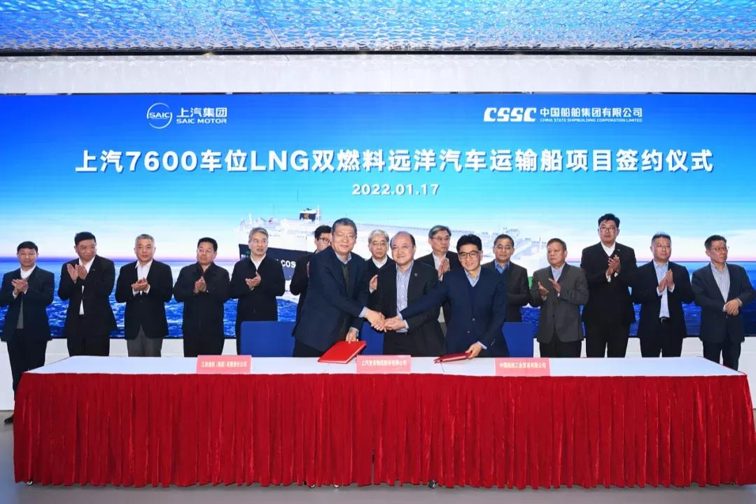 1月17日,中國船舶集團(tuán)旗下江南造船攜手中船貿(mào)易與上汽集團(tuán)旗下安吉物流簽訂2艘7600車位液化天然氣(LNG)雙燃料遠(yuǎn)洋汽車運(yùn)輸船建造合同。中國船舶集團(tuán)黨組書記、董事長雷凡培,上汽集團(tuán)黨委書記、董事長陳虹出席簽約儀式。