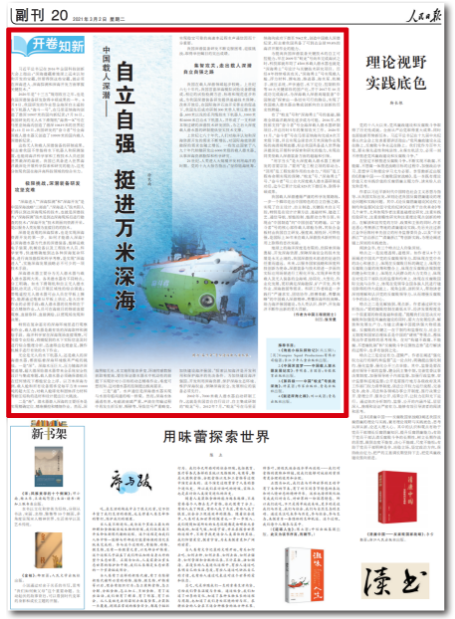 3月2日,人民日報(bào) “開卷知新” 專欄刊發(fā)“蛟龍?zhí)枴笨傇O(shè)計(jì)師中國工程院院士中國船舶集團(tuán)七〇二所研究員徐芑南文章《中國載人深潛——自立自強(qiáng) 挺進(jìn)萬米深海》。