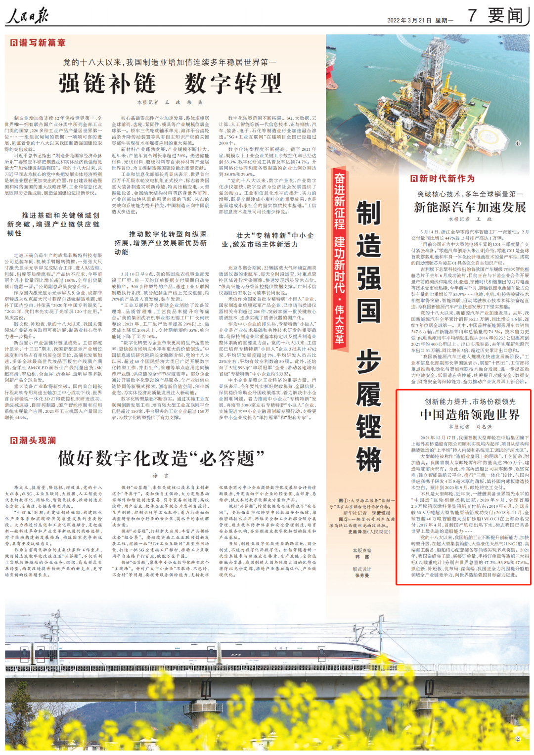 黨的十八大以來,我國船舶工業(yè)不斷提升創(chuàng)新能力、加快轉(zhuǎn)型升級,在超大型集裝箱船、大型液化天然氣(LNG)船、高端海工裝備、船舶核心配套裝備等領(lǐng)域?qū)崿F(xiàn)多點突破。2021年,我國造船完工量、新接訂單量、手持訂單量等造船三大指標(biāo)(以載重噸計)分別占世界總量的47.2%、53.8%和47.6%。抓創(chuàng)新、補短板、優(yōu)布局、謀高端,我國正全力鞏固提升船舶領(lǐng)域全產(chǎn)業(yè)鏈競爭力,向世界造船強國目標(biāo)奮力邁進(jìn)。