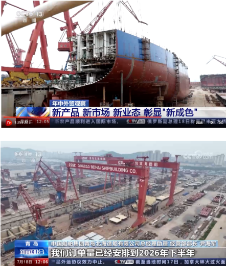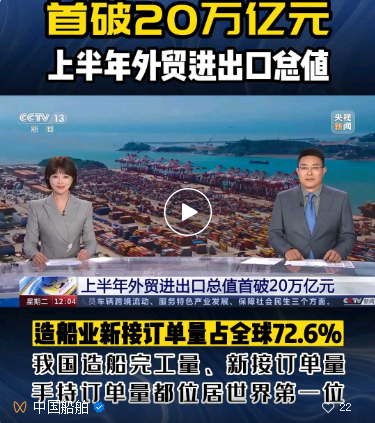 7月18日,央視《新聞30分》年中外貿觀察鏡頭再次對準火熱的造船市場,在出口面臨較大外需壓力的背景下,上半年,中國外貿頂住了壓力、穩(wěn)住了規(guī)模、提升了質量,既呈現(xiàn)出“韌性”底色,又展現(xiàn)了多種“新”的成色。